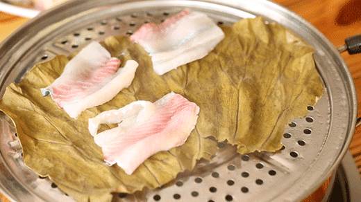 新鲜捞起的鱼经过师傅灵巧的刀工,剔骨切片,每一片鱼肉都厚薄均匀。在蒸锅中,盖上盖子蒸煮1分钟左右就可以揭盖啦。