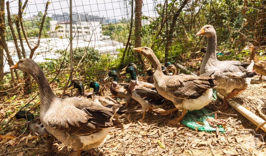 山腰的这个农庄有多处饲养点,自养了各种鸡鸭鹅等。它们都位于斜坡上,十足锻炼了这些动物们的腿部肌肉。