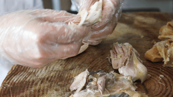 最少半份起叫的老妈手撕鸡,食客下单后,后厨便开始忙活。开边、起皮、拆骨…动作麻利,一气呵成。