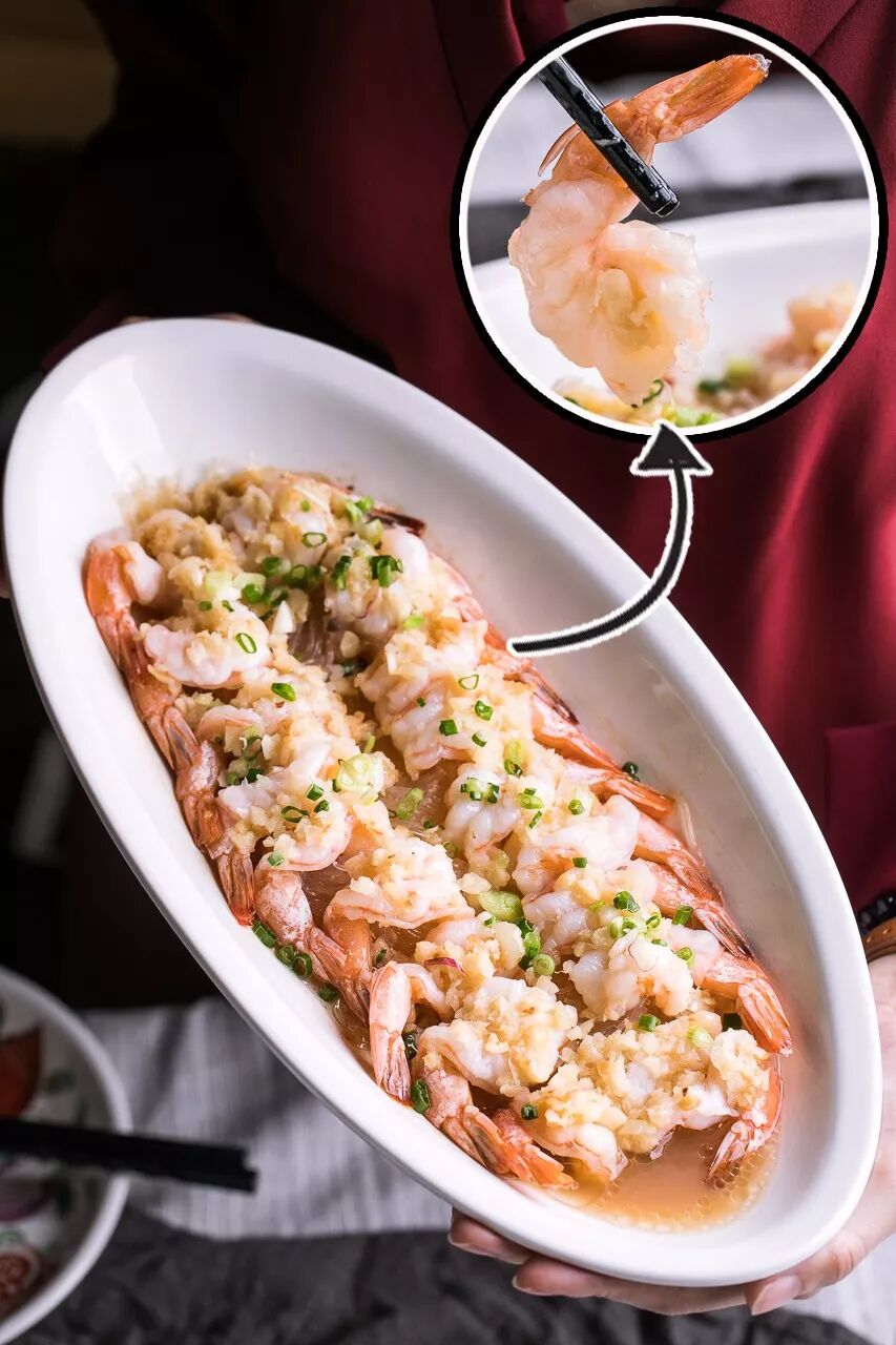 虾肉开边,底下放入爽口的米丝一起蒸熟。准备熟后淋上一勺蒜蓉酱,让虾肉完全吸收蒜蓉的味道,每一口都让人称赞。
