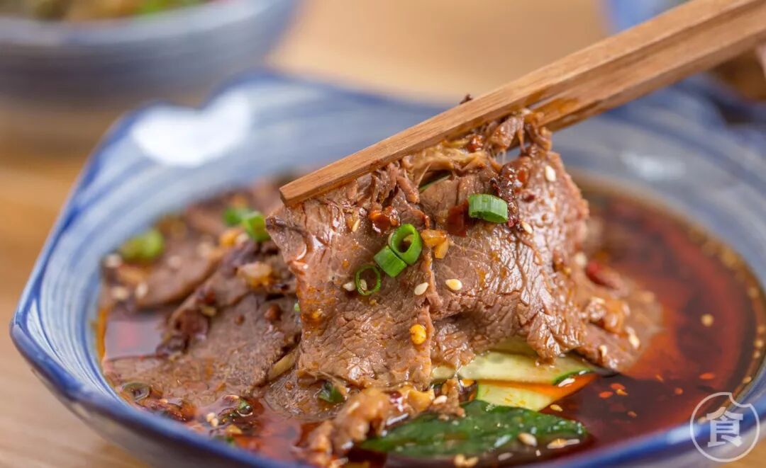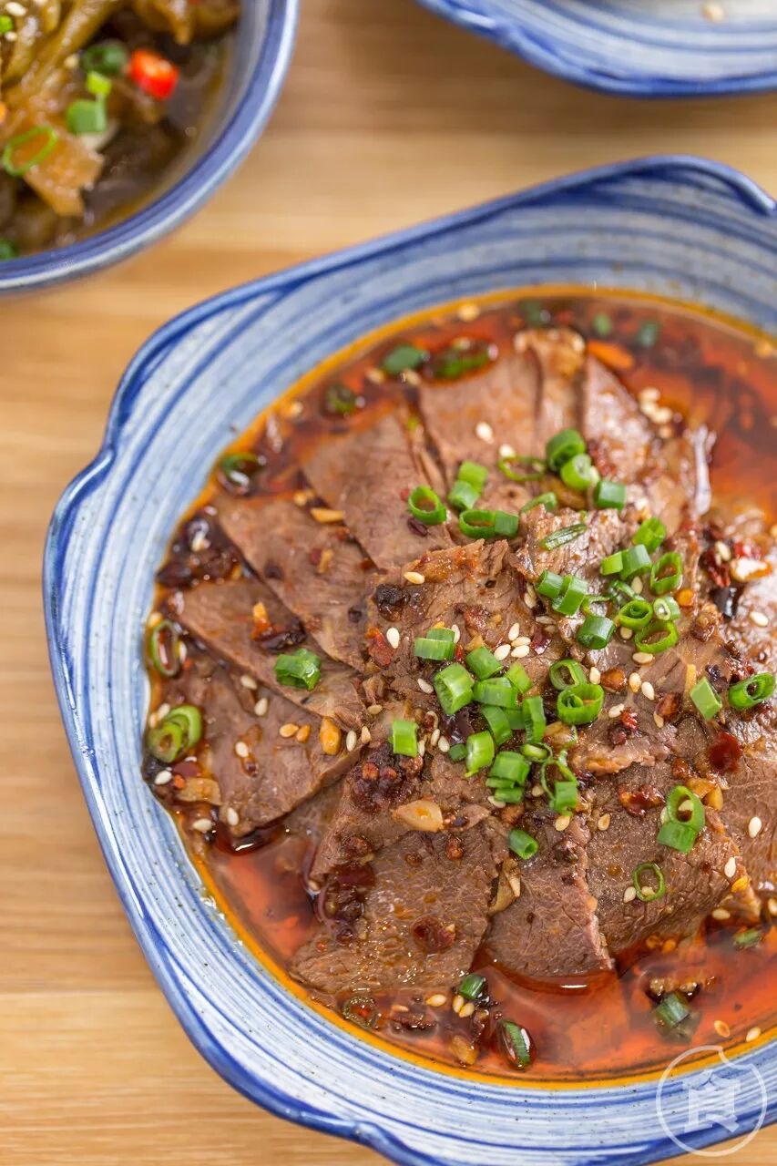 拌牛肉选取半肉半筋的部分,每一份都被切成薄片。筷子夹起一片与牛筋相连的牛肉,软烂酥香,每一口都是鲜辣爽口。