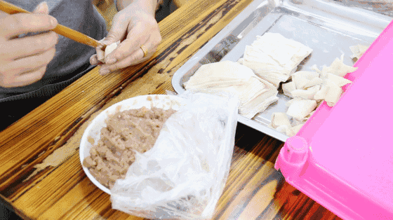 “在还没结婚之前,我也不会包云吞。但是嫁给他之后,我自己也开始学了,我的这种包云吞的手法,还是跟我老公学习的”。