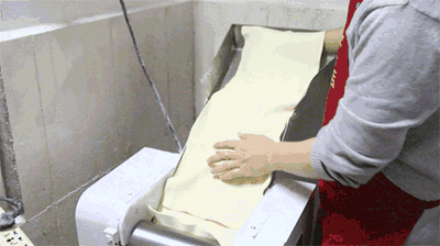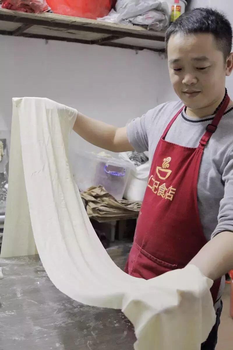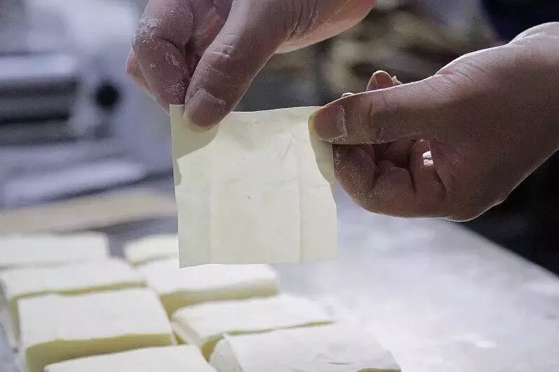 2个小时之后,压好的面皮变得比纸张还薄,只剩下最后一步-切皮,就大功告成。看似简单,但是每一张面皮的背后,都要有十足的耐心。