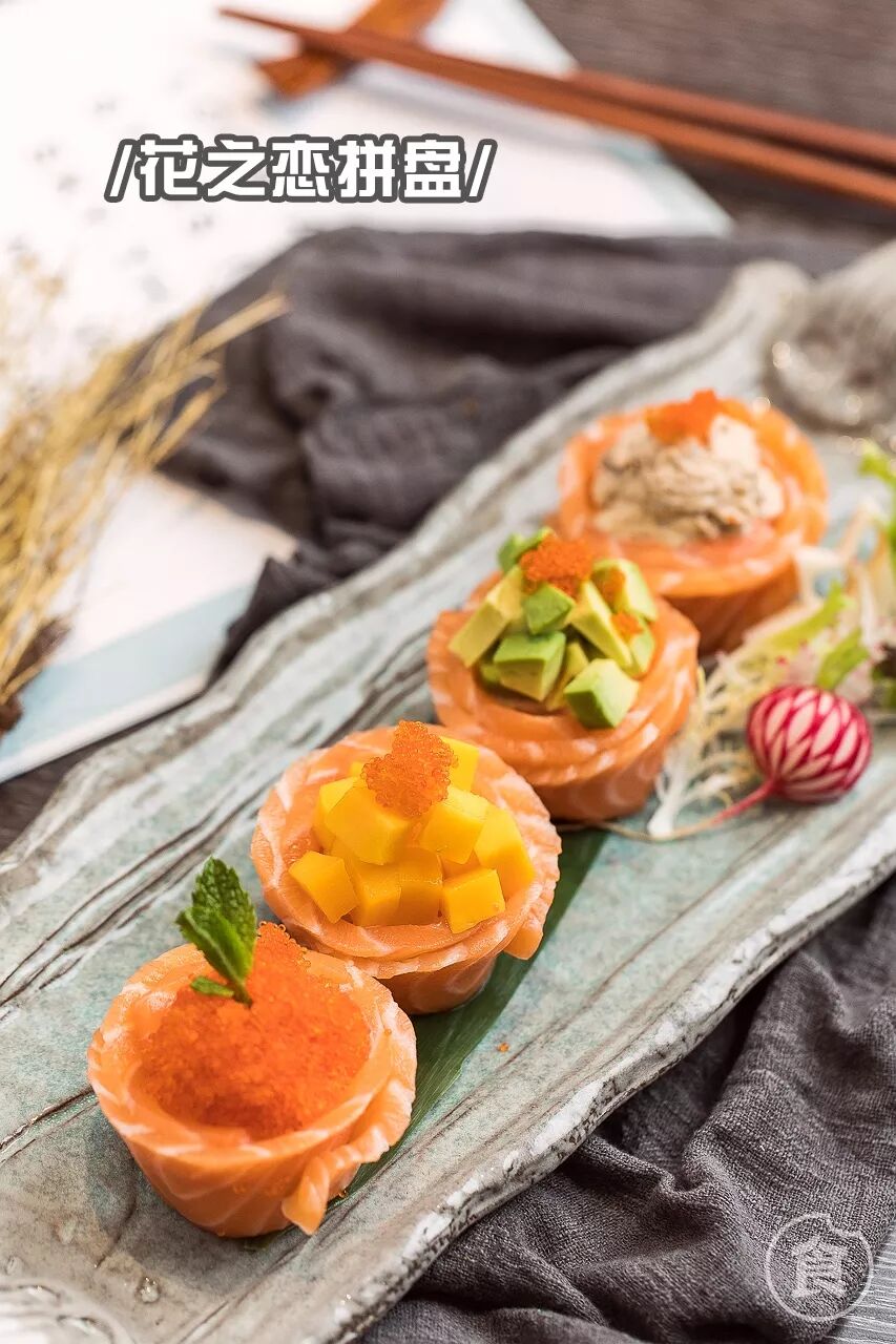 圆形的寿司醋饭被数片三文鱼包裹着,中间注入沙拉酱,顶上放上各种新鲜食材,像一朵含苞待放的小花~