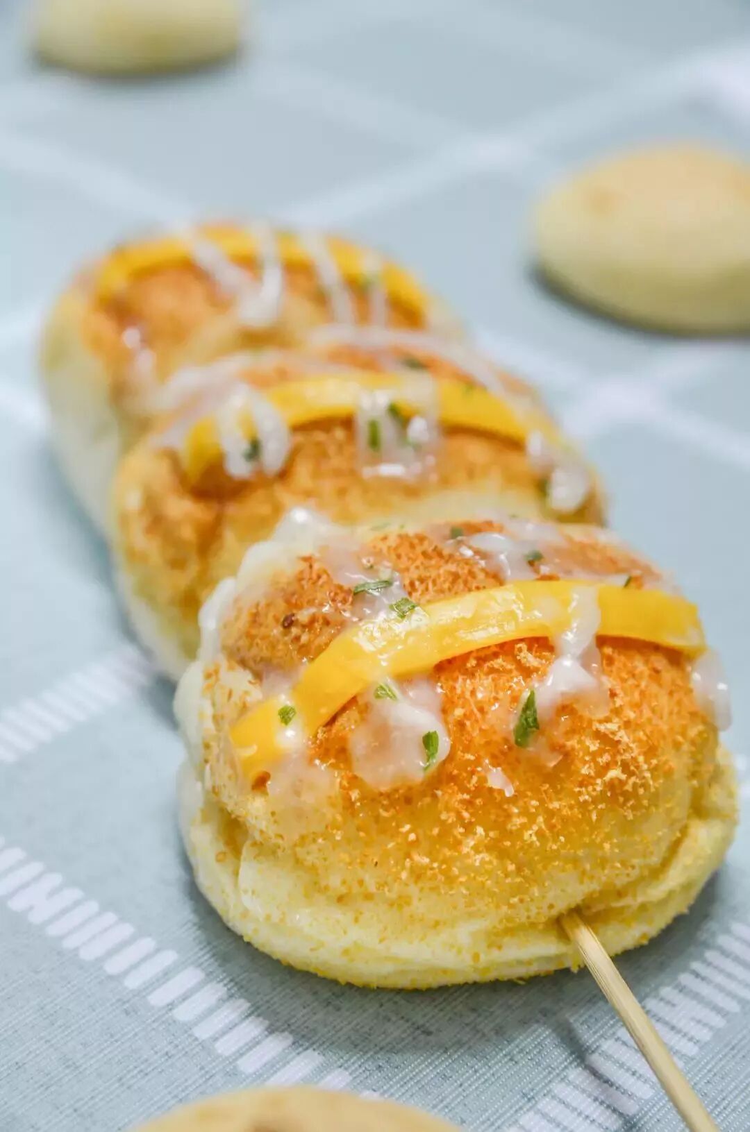 在店内各种面包刷“脸”时,推荐这款芝士串串,成串的它像个大型丸子,同时还拥有诱惑味蕾的颜值。