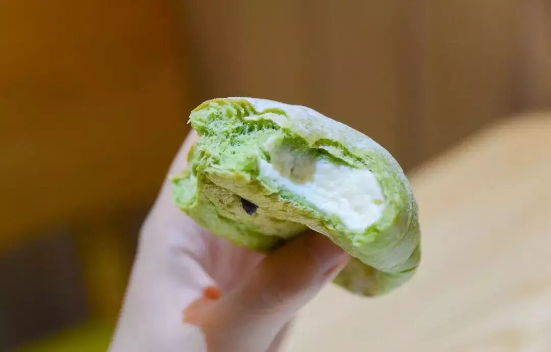 因为面包本身的松软,轻易地就可以将“叶子”撕开一瓣,可以看到半边面包都充满了快要溢出来的大团芝心,咬下去的瞬间,嘴里已经被芝士攻陷,抹茶味也夹于其中。