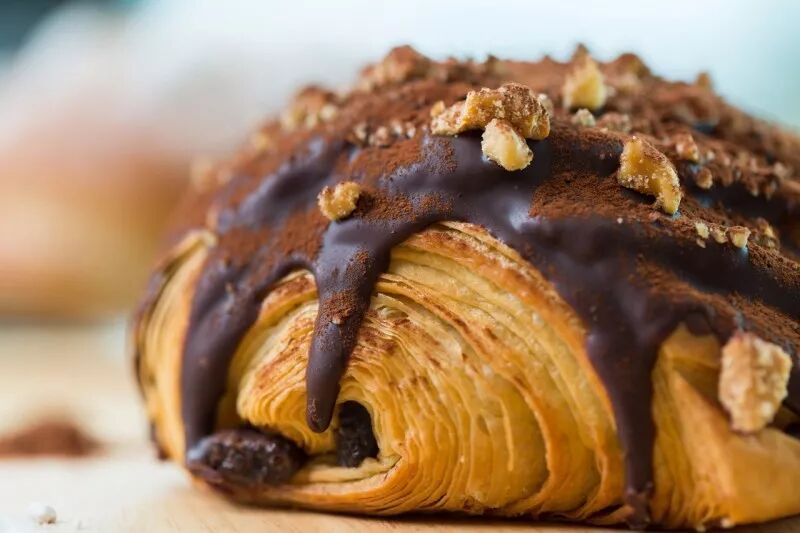 层层折叠,大火烤制后形成酥皮,其特点是外层酥脆,内层松软。适度的甜度、完美的酥皮、金黄色的外观与绝妙的分层内心。