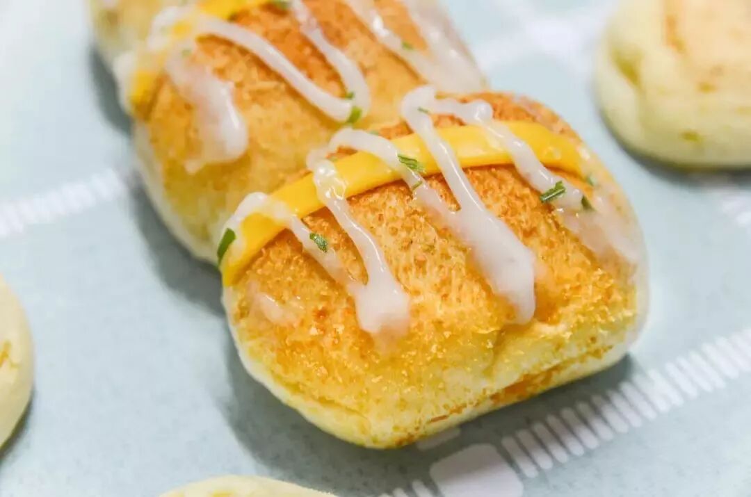 新鲜出炉时带着芝士专属的味道,一大片芝士也在面包上清晰可见,覆上一层蛋白酱,一股满足的味道。