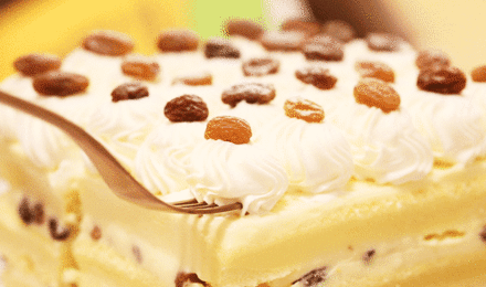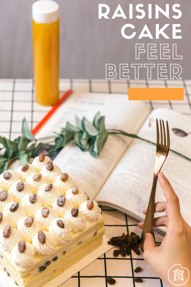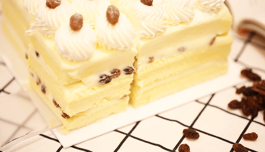 吃不完也可以切开小块和朋友分享哦~ 切开后的蛋糕,里层满满的葡萄干夹杂奶油,恨不得拿起叉子就开吃!