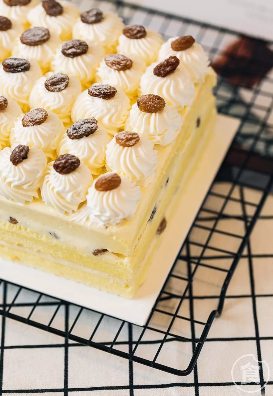 三层蛋糕堆叠,加上满满的奶油夹心,每一层都铺满用朗姆酒炮制过的葡萄干,颗颗饱满大粒,喝饱朗姆酒的葡萄干再不干涩,咬一口都爆酒出来~