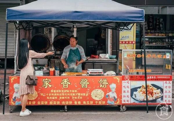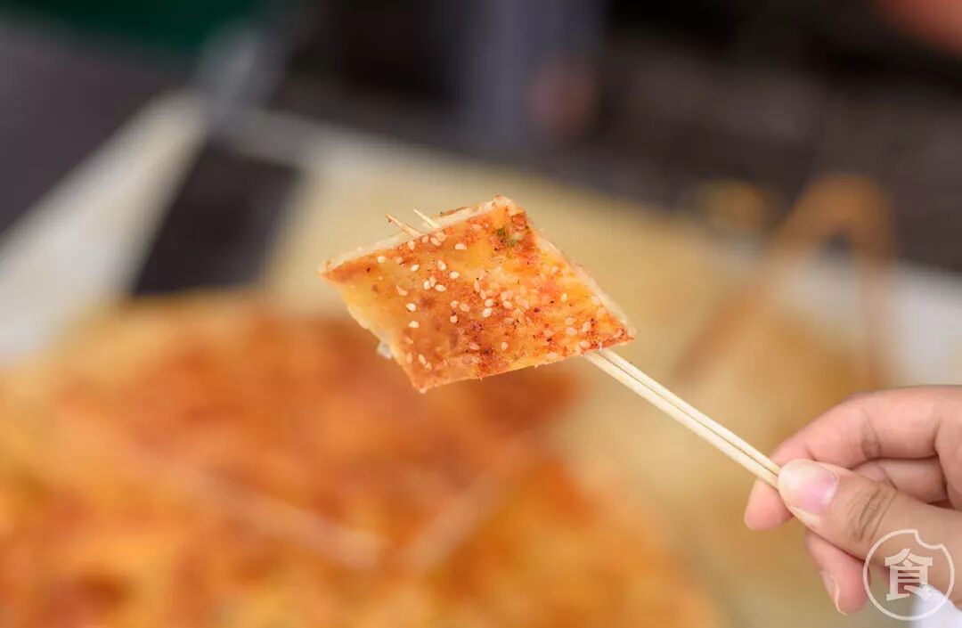 金黄薄脆的酱香饼被老板麻利地切成小块