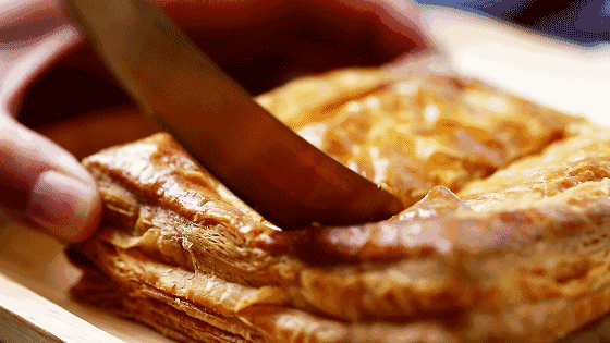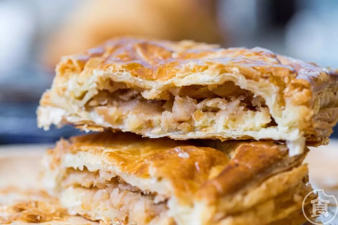 外层酥到掉渣的酥皮,外酥内湿软,深褐色的外表下是蜂窝一样轻盈的内在,咬下后满口的奶油味和苹果香味的结合,吃一口就会爱上。