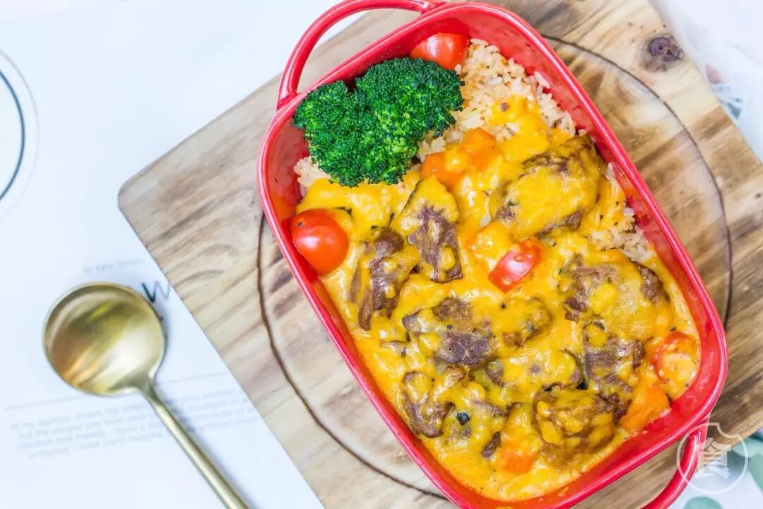 与我们平常吃到的焗饭不同,附近牛排饭上面铺满的不是芝士,而是南瓜酱。牛肉保持着鲜嫩的口感,粒粒分明的炒饭与淡淡南瓜清香,可以说是相当治愈了。