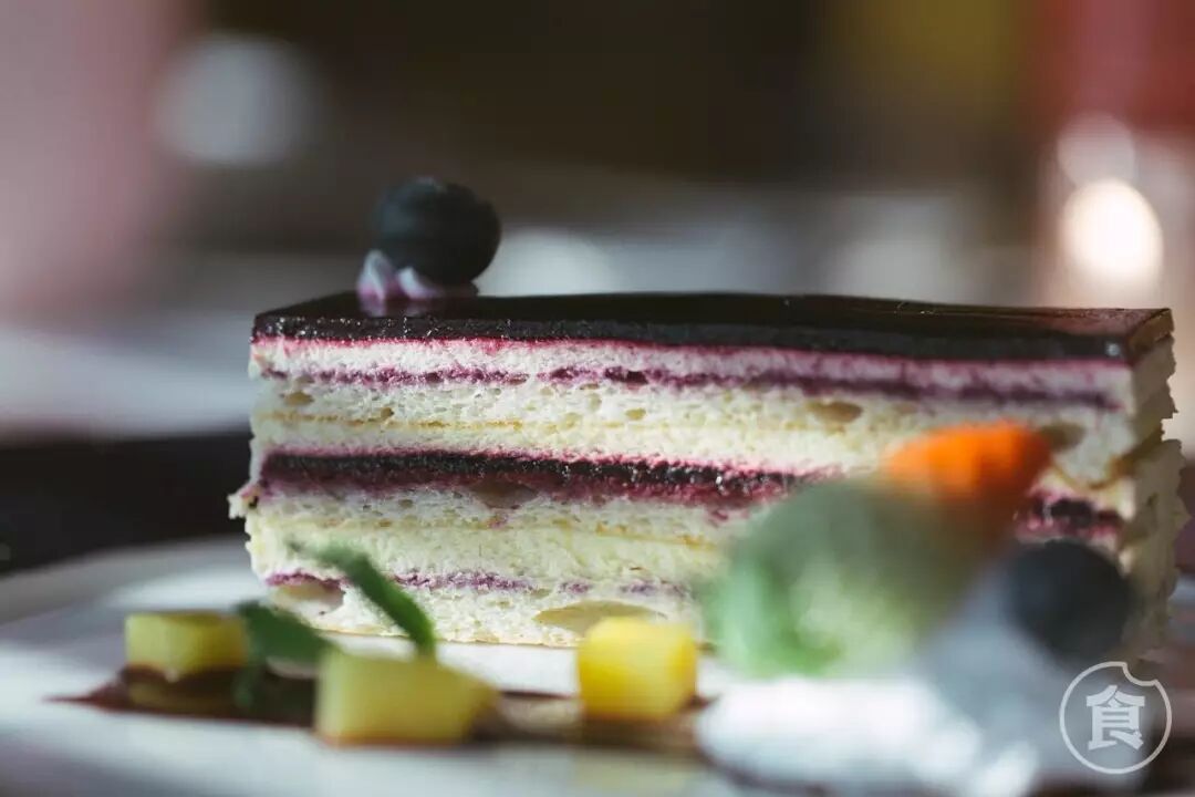顶层是用黑醋栗制成的淋面,中间是用海绵蛋糕、奶油、果酱等一层层叠出来的,这是一款让人视觉与味觉双重享受的甜品。