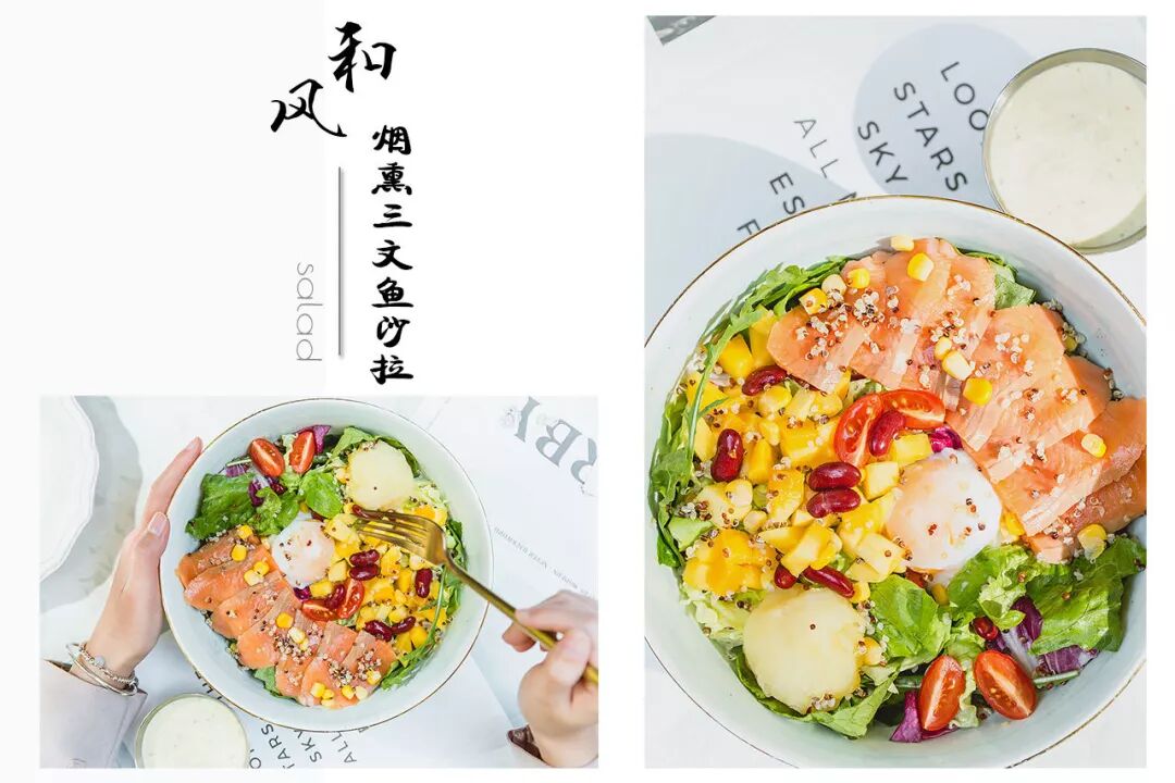 看着这满盘的“春色”就令人胃口大开,选用肥美的三文鱼,切片后进行烟熏。然后加入当日的新鲜时蔬,清爽可口,低热营养又没负担。