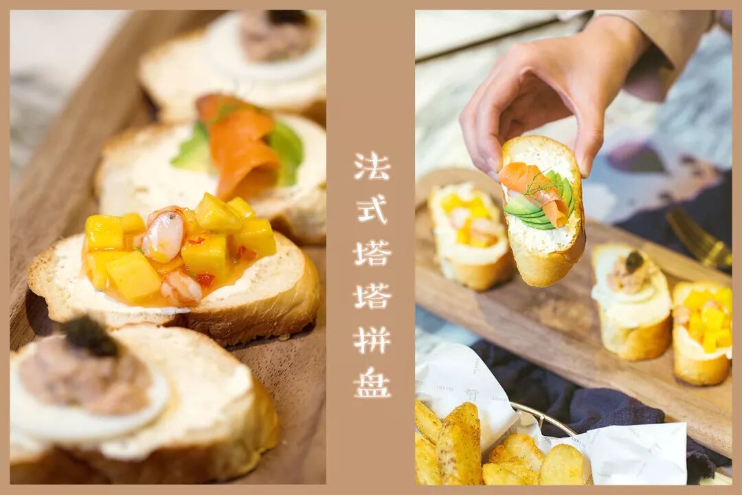 用法棍作为基底,在上面放上新鲜食材。鱼子酱&吞拿鱼、三文鱼&牛油果、芒果&大虾,简单的搭配也能迸发出惊喜感,作为餐前小吃也非常适合。