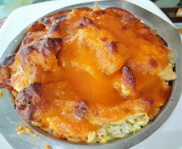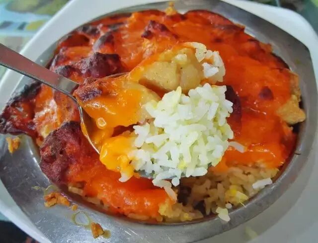 茄汁覆盖的是切成条块的猪扒。底下的炒饭颗粒分明,有点干身,还有一些蛋碎混着。整体吃起来口味有些单调,猪扒也有点硬,毕竟是纯瘦肉啊。