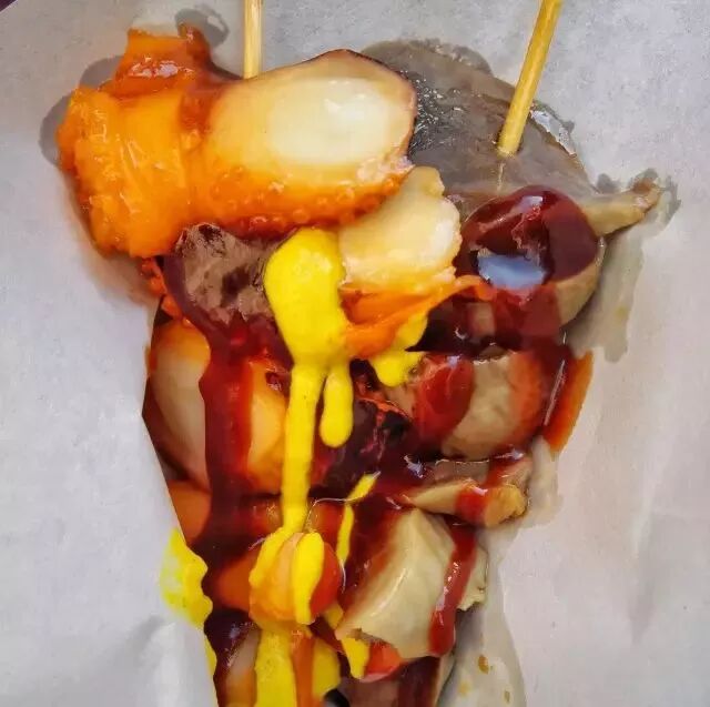 我们买了一串火鸡肾和一串墨鱼,超好吃!!用一张油纸包住,淋上秘制酱油和黄芥末。因为它们煮熟后会过冰水,所以口感很爽口。重要的是一点腥味都没有,不会腻。超后悔买少了。