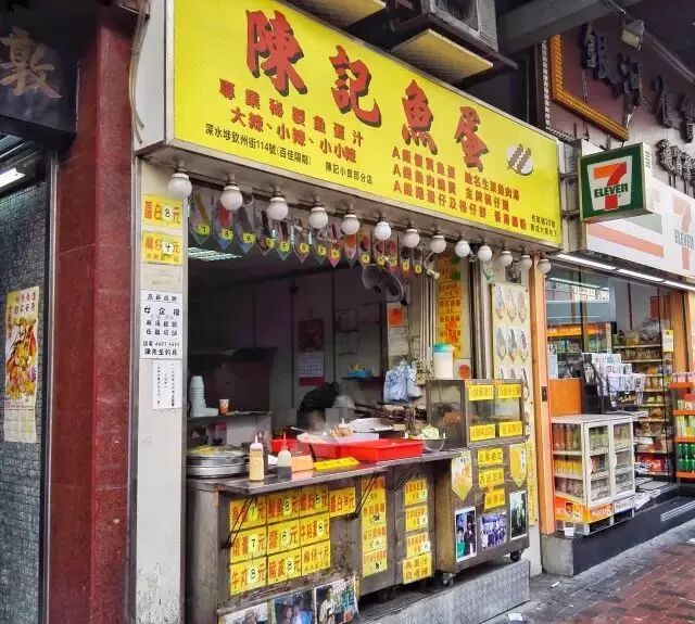 陈记鱼蛋有很多分店,这一家在深水埗。它的店面有超多明星的合照。可以试试鱼蛋和干蒸。干蒸的肉是鱼肉,价格都很实惠。