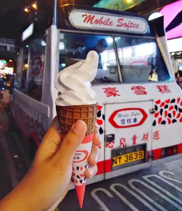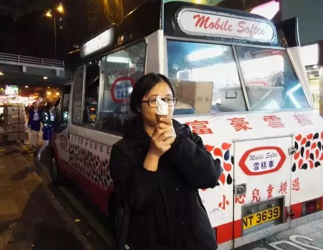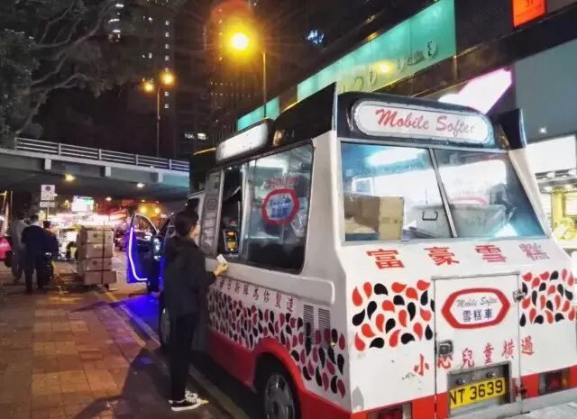 后来去庙街的路上,我们在广东道上偶遇了富豪雪糕车。黑蓝车顶,红白相间的车身,格外显眼。这种特有的香港文化,现存只有少量几部在热闹的地方流动了,听闻一般会出现在朗豪坊、广东道和金紫荆广场附近。一支软雪糕10HK,可以刷八达通。