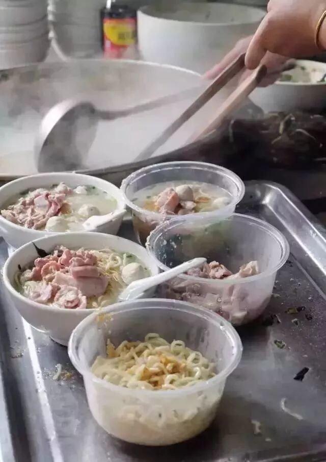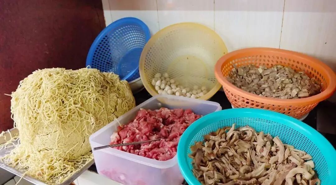 物价飞涨的今天,许多店要不升价,要不减少用量。这里的汤面与26年前一样,依旧5元一碗。台上放满了材料,猪肉、猪肚、猪场、猪肉丸,最显眼的莫过于堆成小山的面。