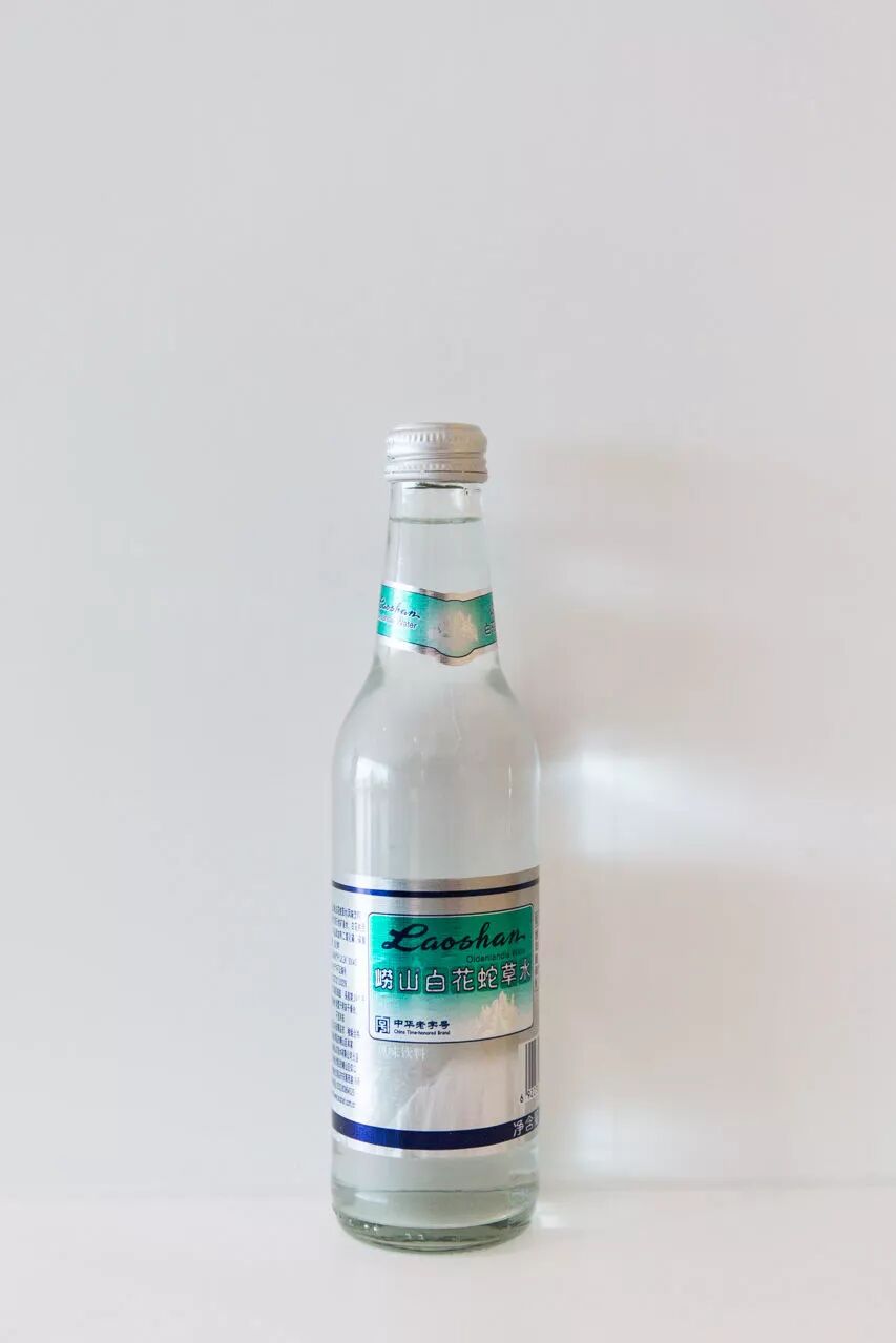 玻璃瓶装的崂山白蛇花草水看起来蛮高大上的