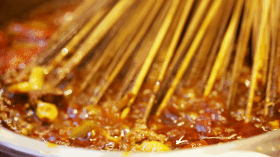 锅底的味道取决于炒料。辣椒、花椒等底料经过炒制后煸出香味,这时再加入汤水才能成就一桌美味的基础。上桌后越煮越浓稠,越煮越火辣,即便到最后都不容易出渣。
