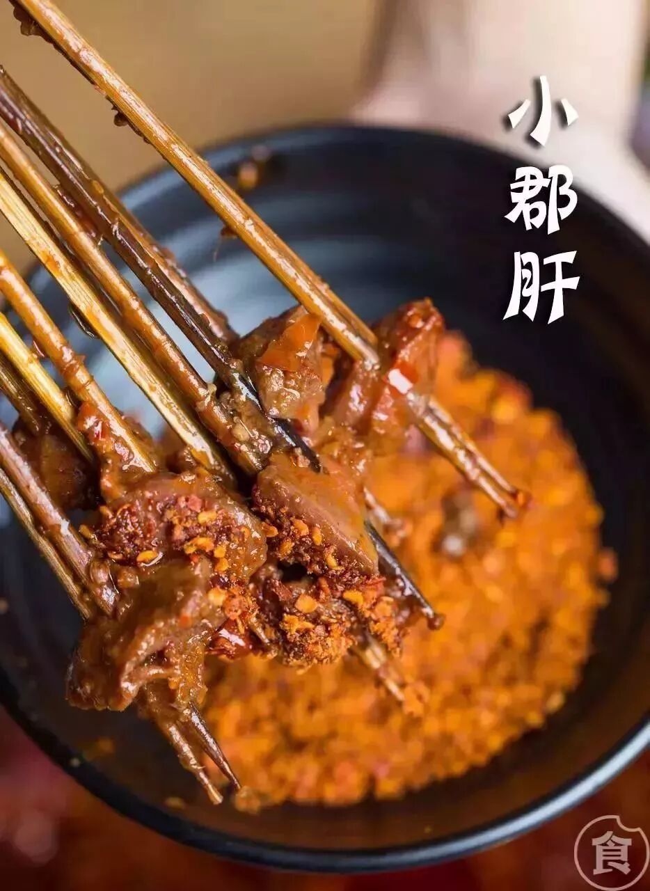 撸串强烈推荐小郡肝,一串接一串根本停不下来!因为经过提前处理腌制,所以它没有腥味,滚上一层辣椒碎,爽脆香口。