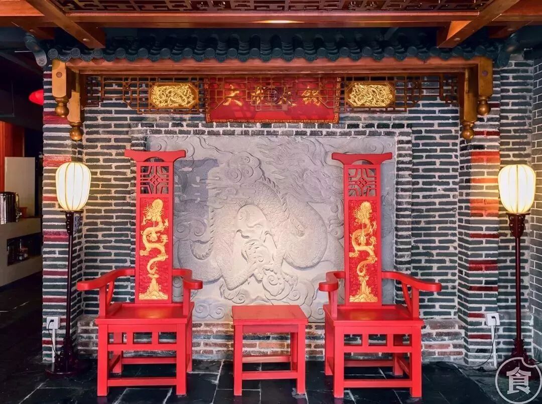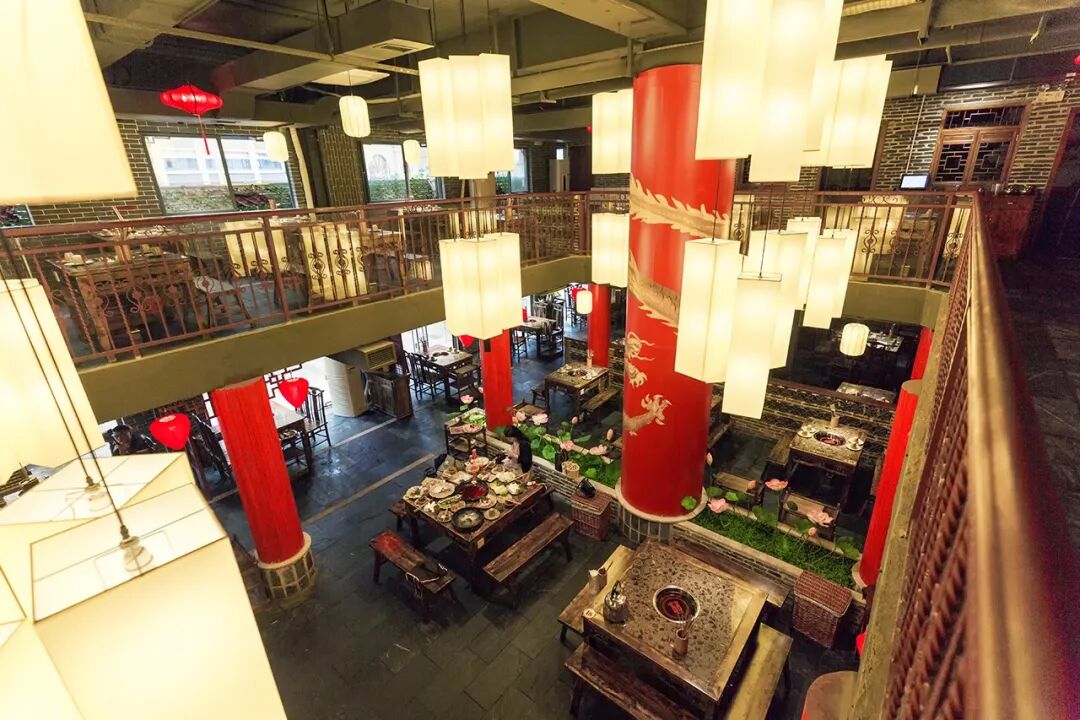 一楼大厅的古色古香的灯笼高高挂起,还有精致的荷叶装饰,厚实的雕花桌椅,放佛都让人置身在重庆之中。