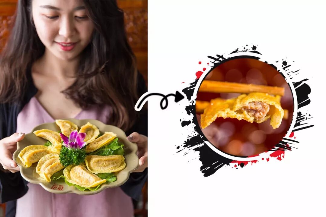 讲究手艺的一门菜,将鸡蛋煎成薄薄的蛋饼,里面包裹着厚实的肉馅。在红油锅里涮煮2分钟,趁热一咬, 汁水放佛要溢出来。