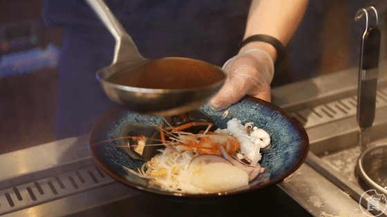 将金边粉与海鲜烫熟后,加入牛骨清汤,撒上九层塔等辅料,一碗海鲜金边粉就做好了。