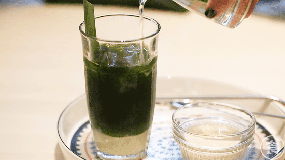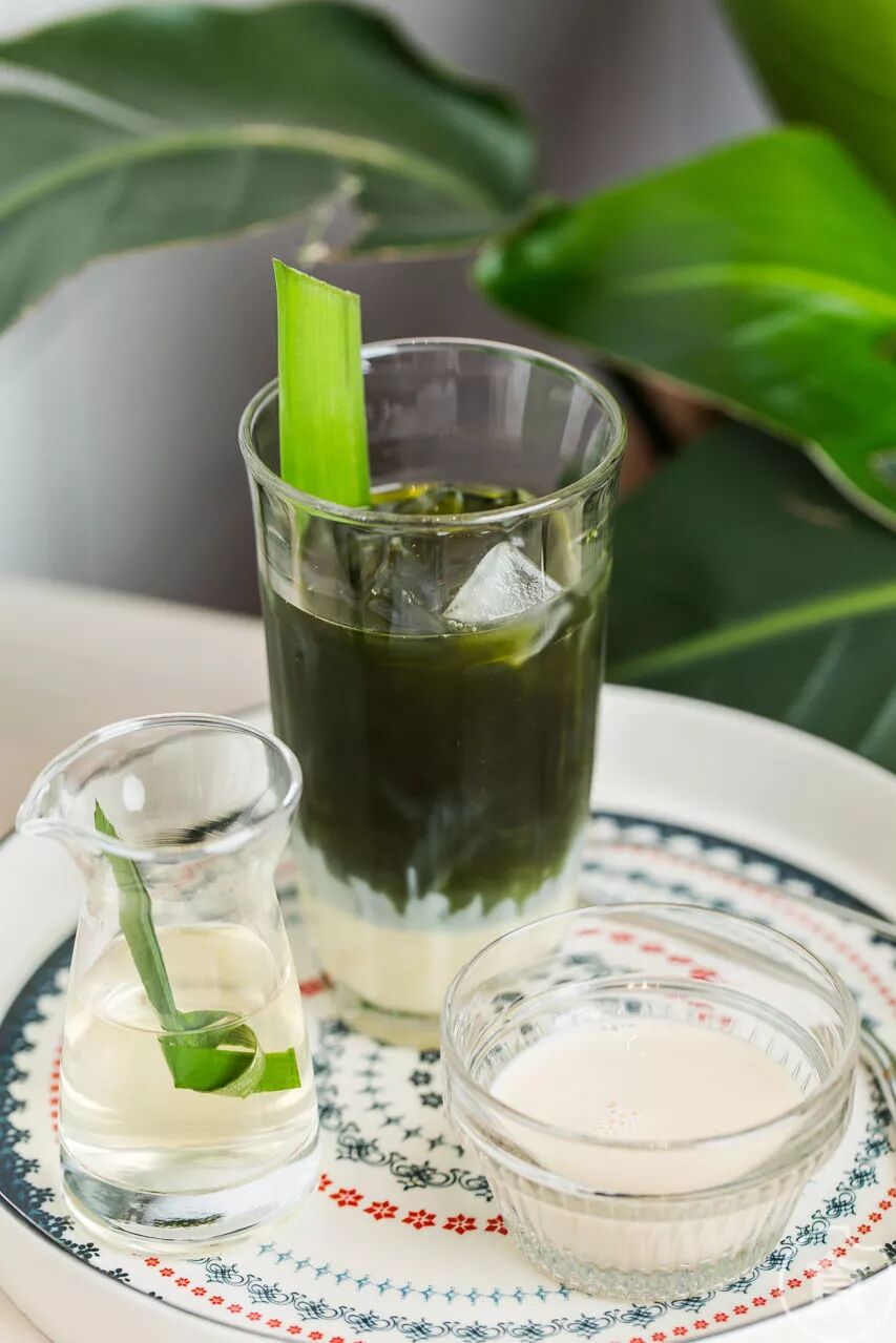 这杯饮品非常有趣,上桌会提供一份班兰叶汁和一份黑白淡奶,可以根据自己的口味将它们适量倒入杯中,搅拌均匀后就可以饮用了。