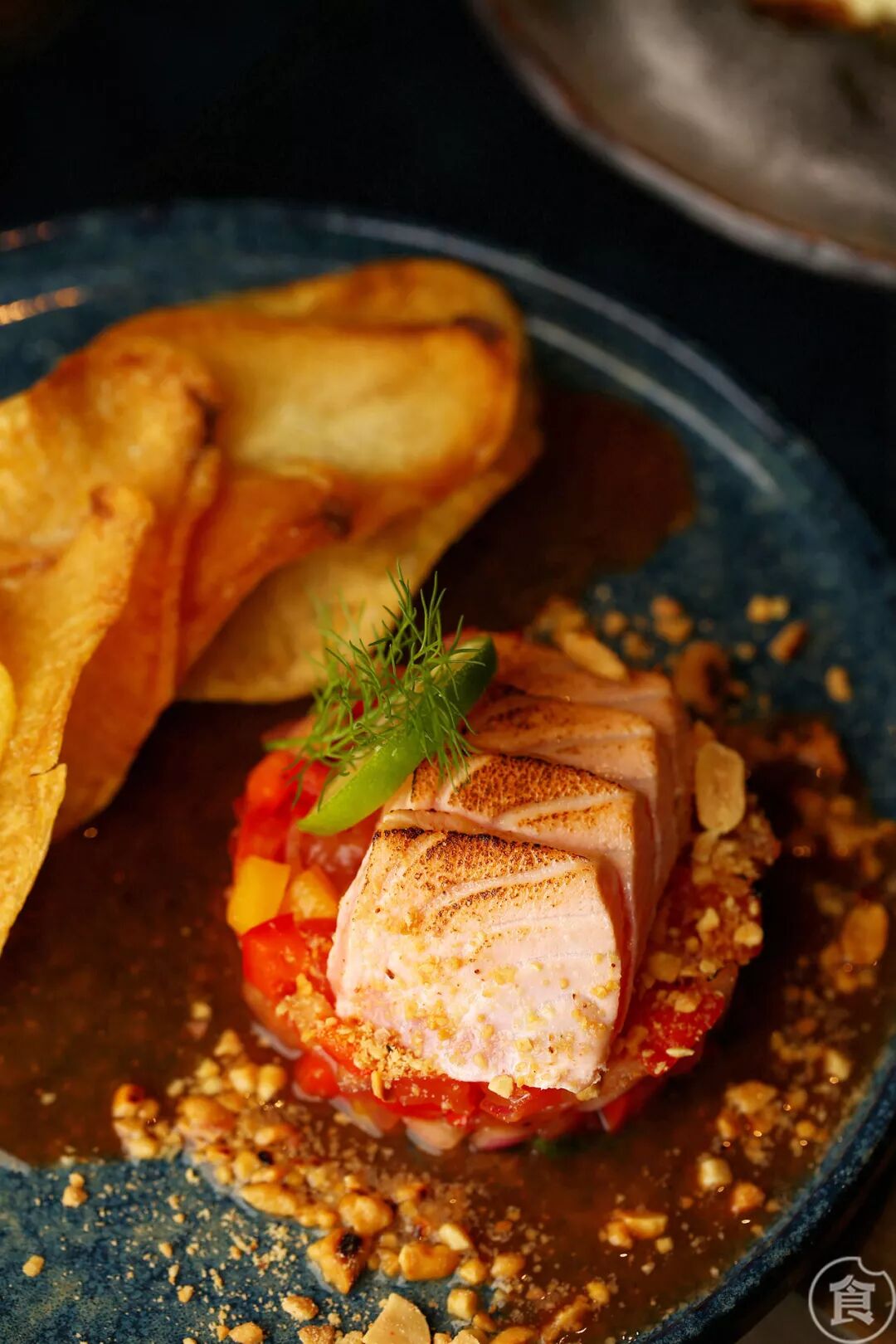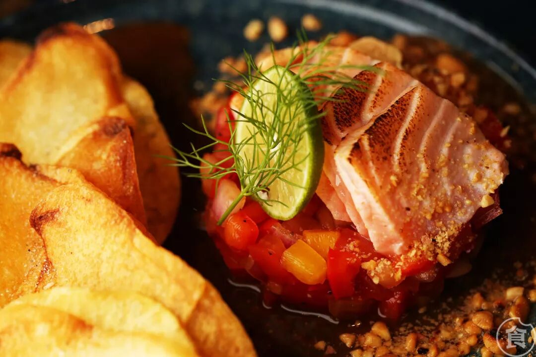 塔塔酱酸甜开胃,由红黄圆椒、番茄、洋葱切碎,加入Tabasco、柠汁、香草制作而成。新鲜三文鱼拌上tartar sauce,搭配特制的柠檬盐味薯片一起吃,鲜嫩可口。