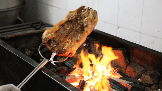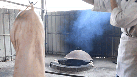 每年卖出2万多头烤乳猪,最重要还是靠烤的技术!起骨——腌制——上叉——捆扎,当这4个步骤完成以后,就开始手工炭火烤乳猪。