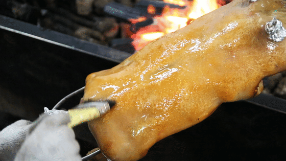 好不容易等了1个多小时,终于等到窑猪的第一次出炉。此时猪皮已被窑的金黄通透,并且还带着一股浓郁的肉香。
