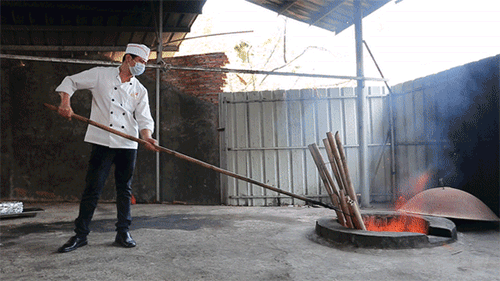 2小时之后,大厨便要将腌制好的玉林猪,拿到窑洞,准备生火窑猪。为了做好土窑猪,富杰的梁老板特意让人打造这2个窑洞,用最古老的方法炮制。