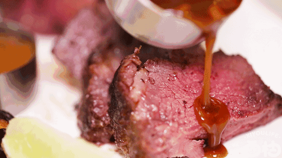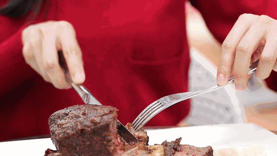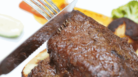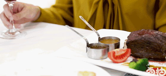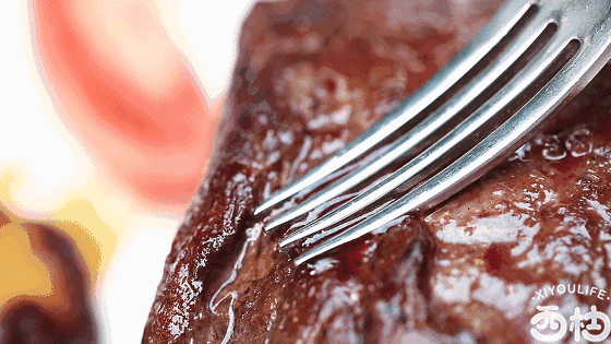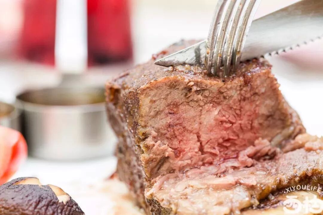 每块牛排都先煎后烤,经过高温慢煮之后,肉汁完全紧锁里面,用刀叉大力压下去,bi~地一下,仿佛跟火山爆发一样,肉汁随时喷射出来。