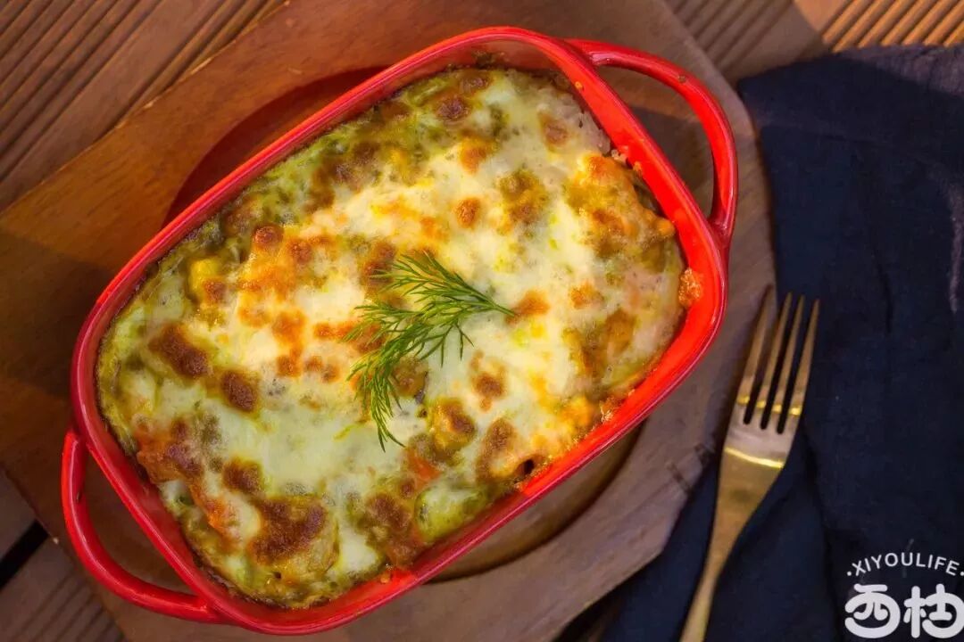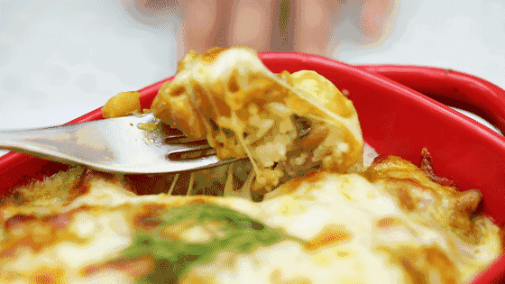 一定要趁热吃,趁着这股热乎劲能将芝士拉得高高的。鸡块铺满整盘焗饭,吃一口就能感受到满满的幸福感。