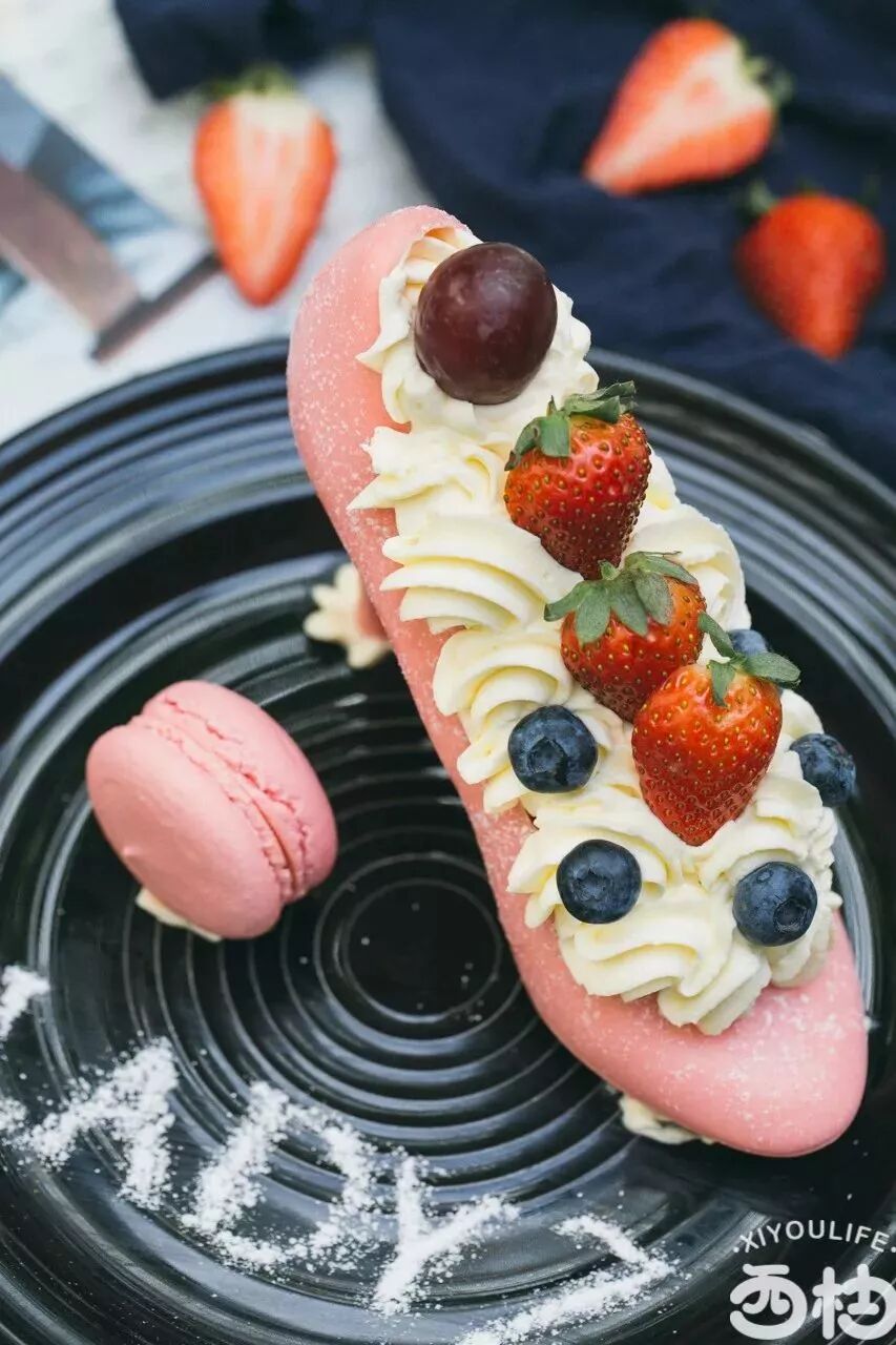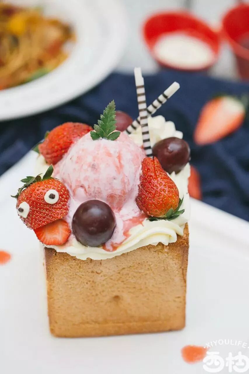 一款搭配草莓雪糕和草莓水果的吐司,草莓的这身“装扮”,让人看到就想噗嗤大笑。提到草莓就能想到初恋的浪漫,没想到也能如此搞怪。