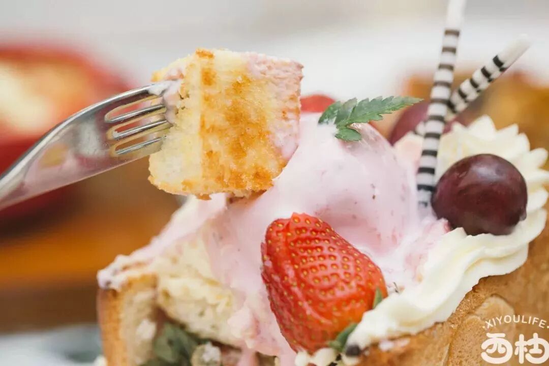将吐司外层切开,里面的小吐司仿佛要溢出来。烤得香脆的它,搭配上层的草莓雪糕一起吃,能感受到冰火两重天的感觉。