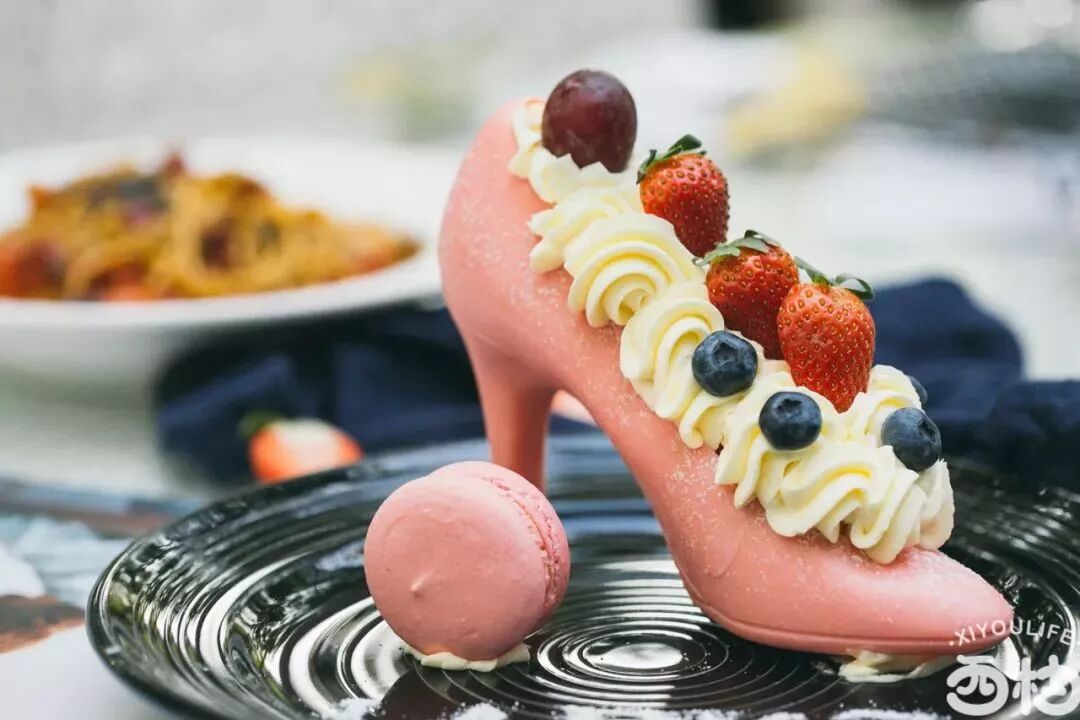 他家的每一款甜点,都花费不少心思。用法国模子做成的巧克力高跟鞋,搭配少女的酥胸-马卡龙,这一刻少女心简直一秒炸裂。