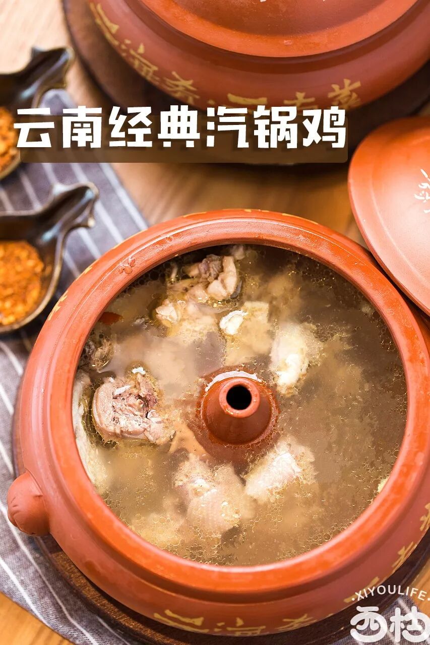 汽锅鸡是由蒸汽将鸡蒸熟,这样蒸出来的鸡肉和汤都最大程度的保留了鲜味。每一锅汽锅鸡可都是要蒸足4个小时的!