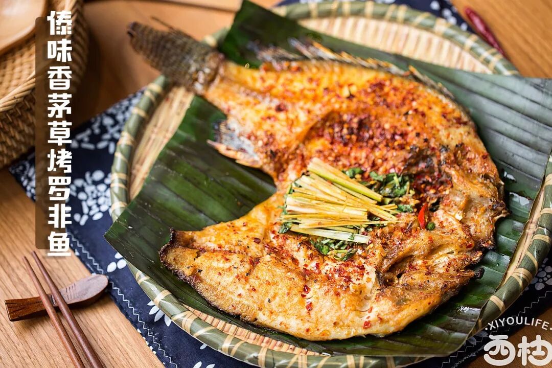 香茅草烤罗非鱼是西双版纳当地特色的一种烤鱼,将罗非鱼去骨后加上香茅香草等佐料烤至表面金黄香脆,鱼肉的鲜与香茅的香融合得非常完美。