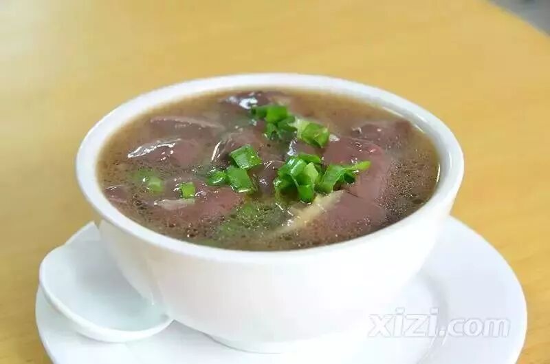 但是我们每次必点的还是那一碗猪红。一点小葱点缀,趁热吃味香浓郁,一上桌两个人就迫不及待开抢起来。
