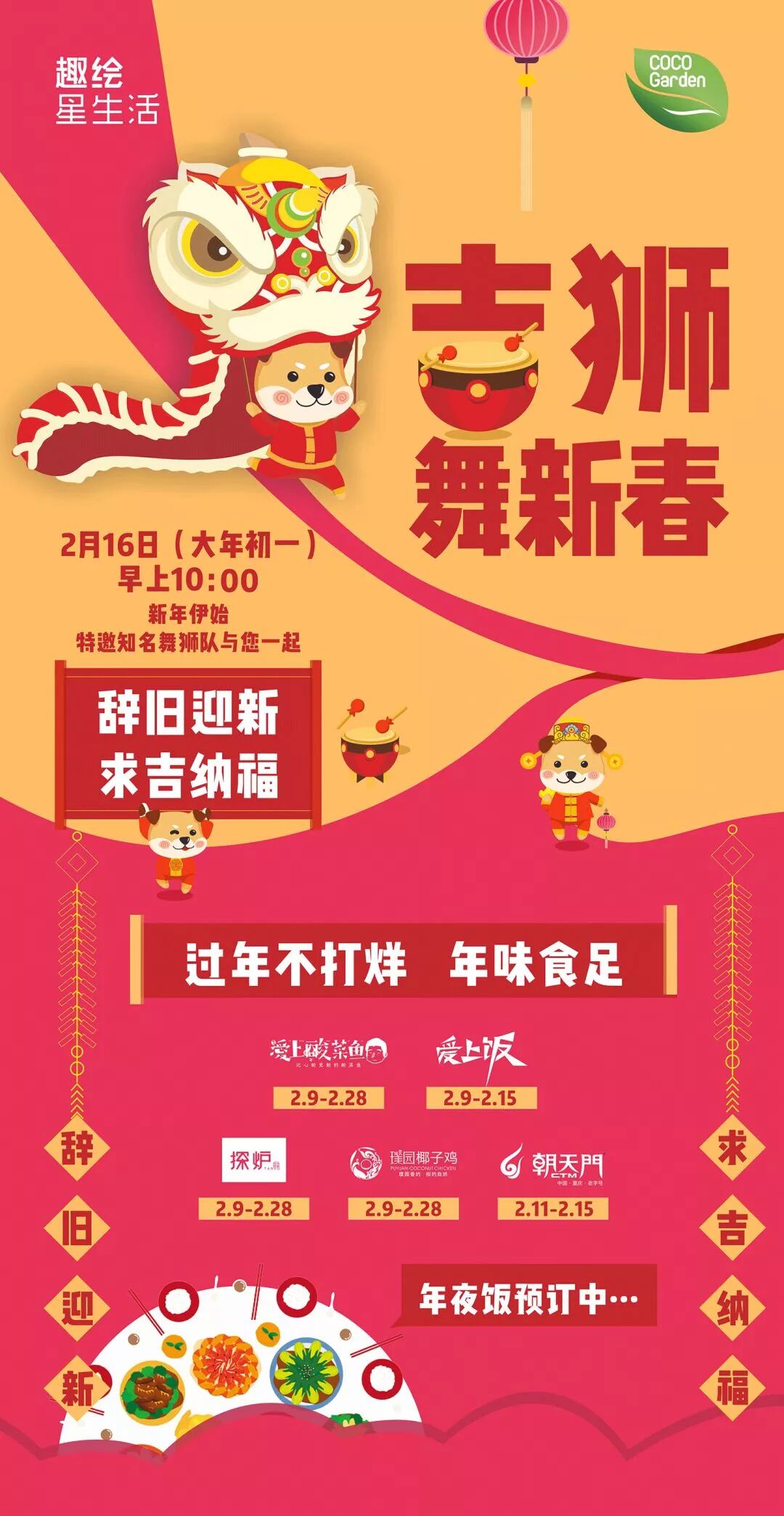 2月16日上午10:30-12:00(大年初一),湖畔生活店邀约专业舞狮队,在大年初一营业开始时间,进行舞狮表演,当然财神爷也会来现场派金币(时间:2月16-20日)