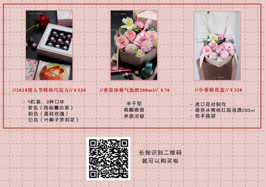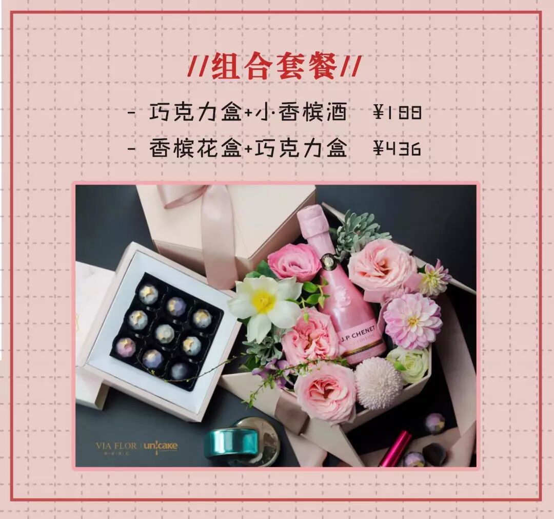 除了甜甜的巧克力,这里还有其他小花样!可以选择以上单卖的礼物,也可以选择组合装的礼盒。酸甜的气泡酒搭配小花盒,粉粉的充满少女心,让人抗拒不了。