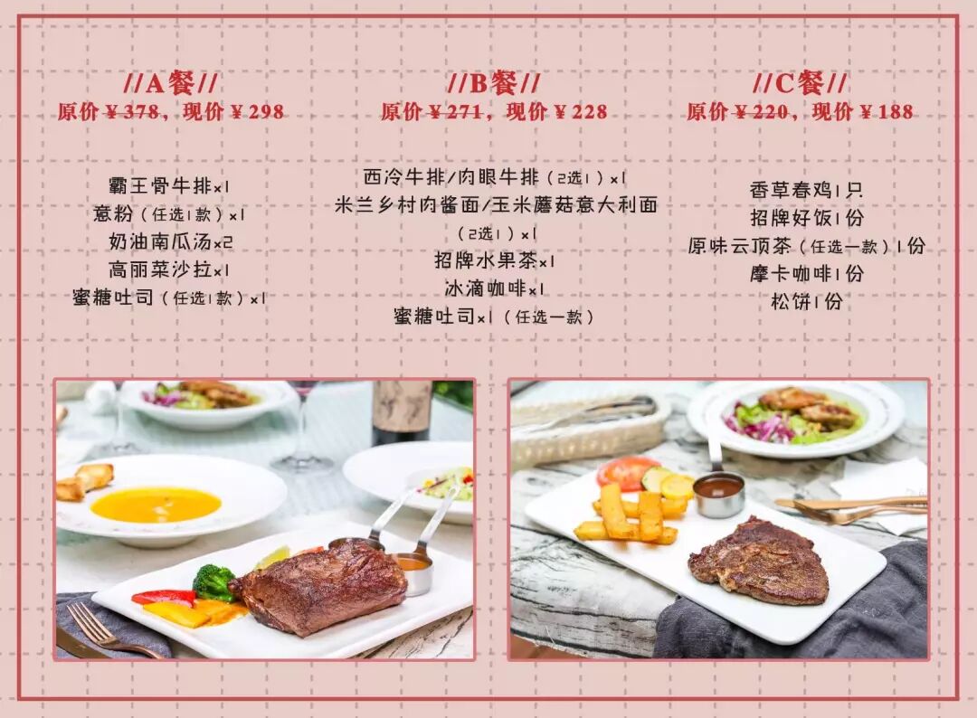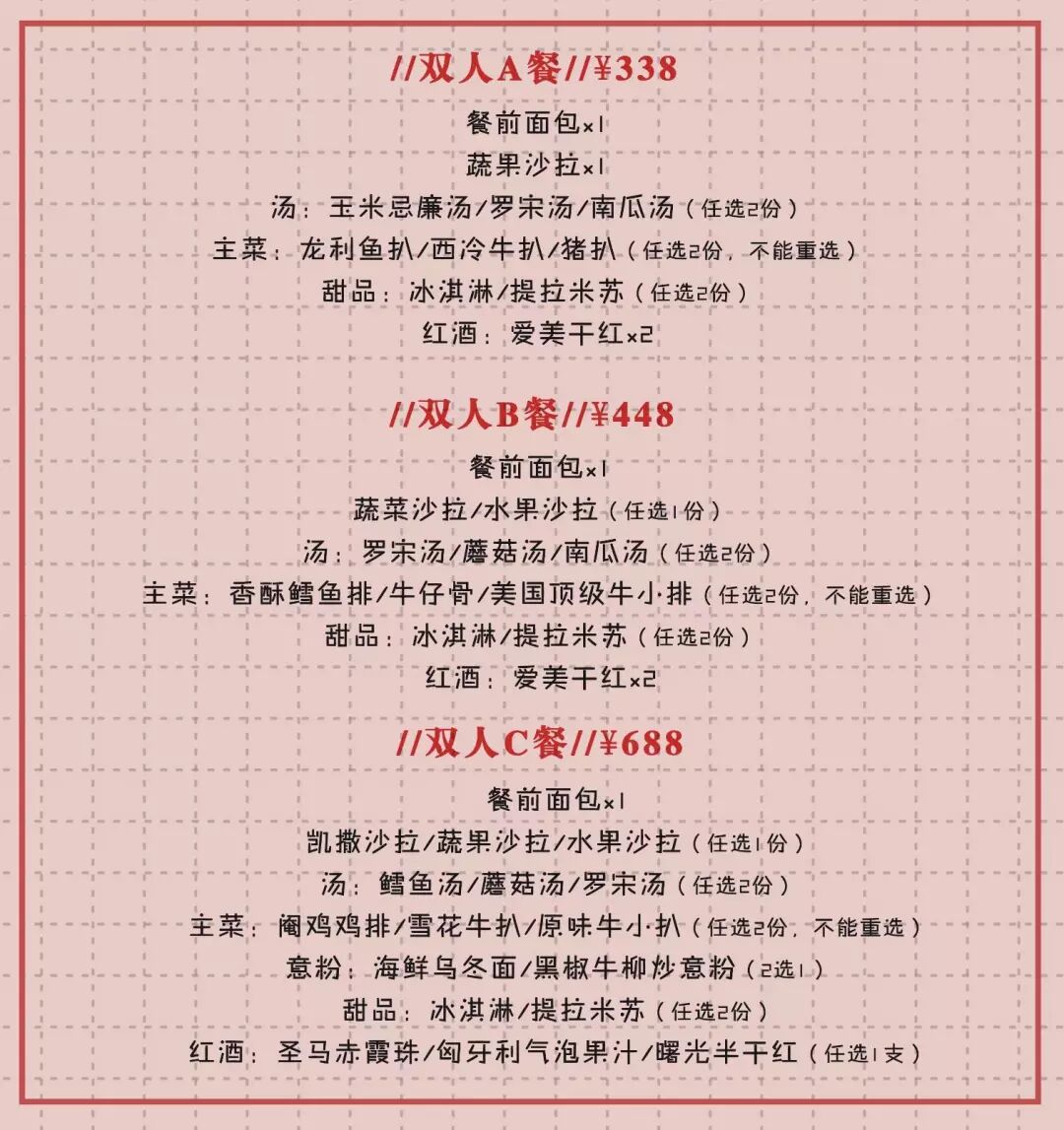 这里有三种双人套餐,但都搭配上了红酒。我想,一杯红酒间的相处,可以让白天的浮躁安静下来,把周围的一切都变得温柔起来吧。