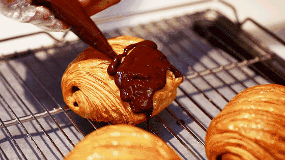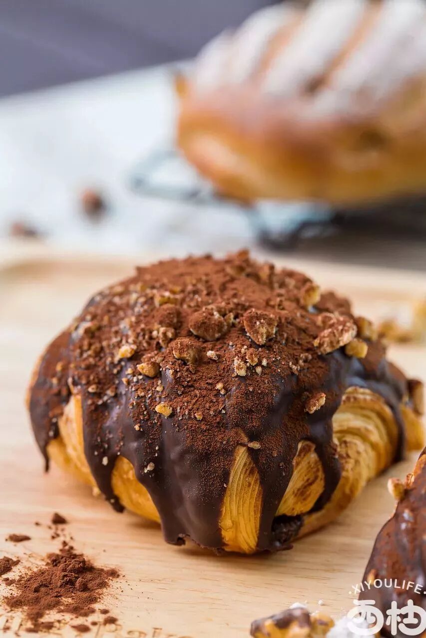 “脏脏包”的基本结构为:可颂起酥面包+巧克力夹心+巧克力淋面+可可粉+坚果碎。想要做出一个完美的“脏脏包”,从原料到制作,每一步都需要非常用心。