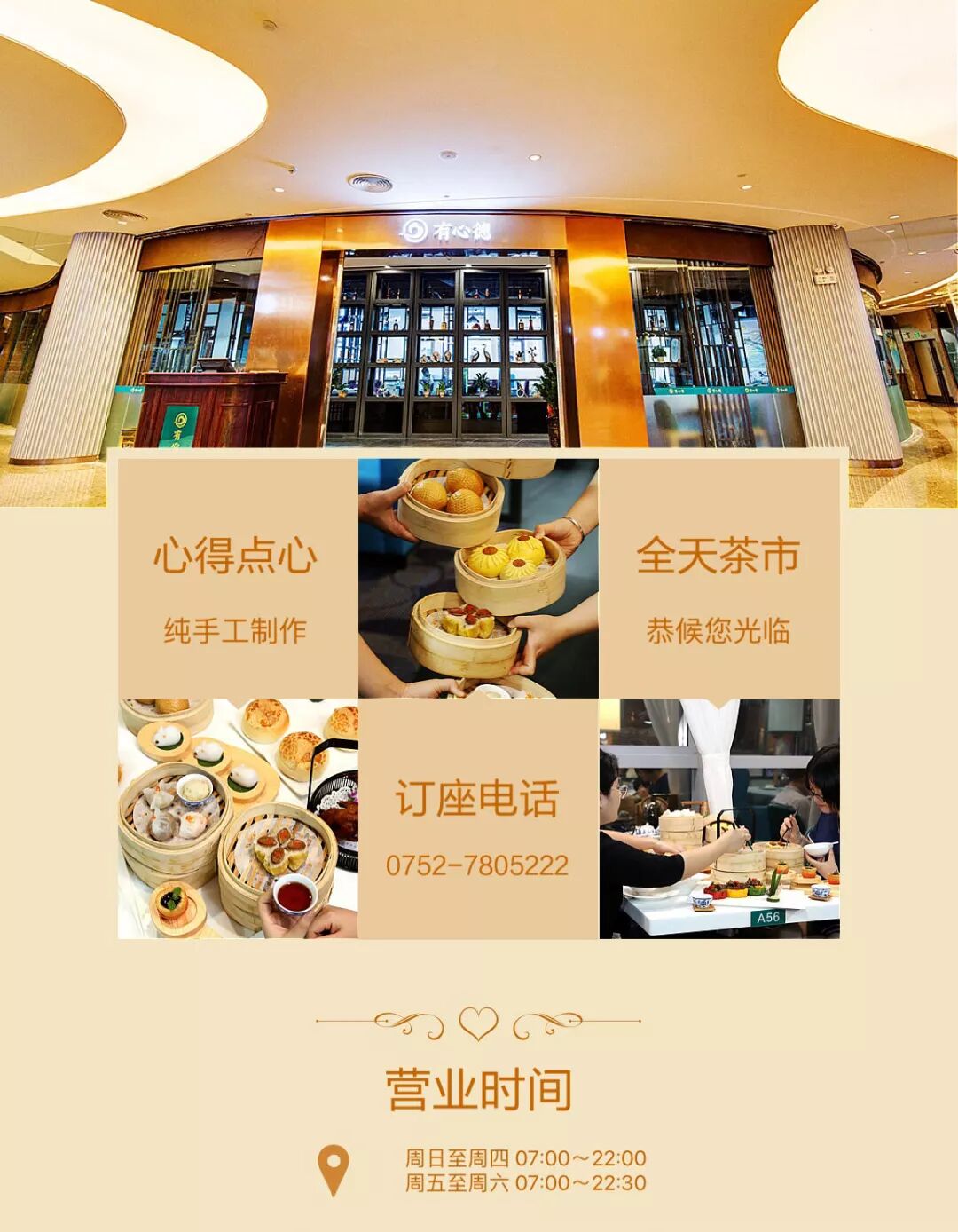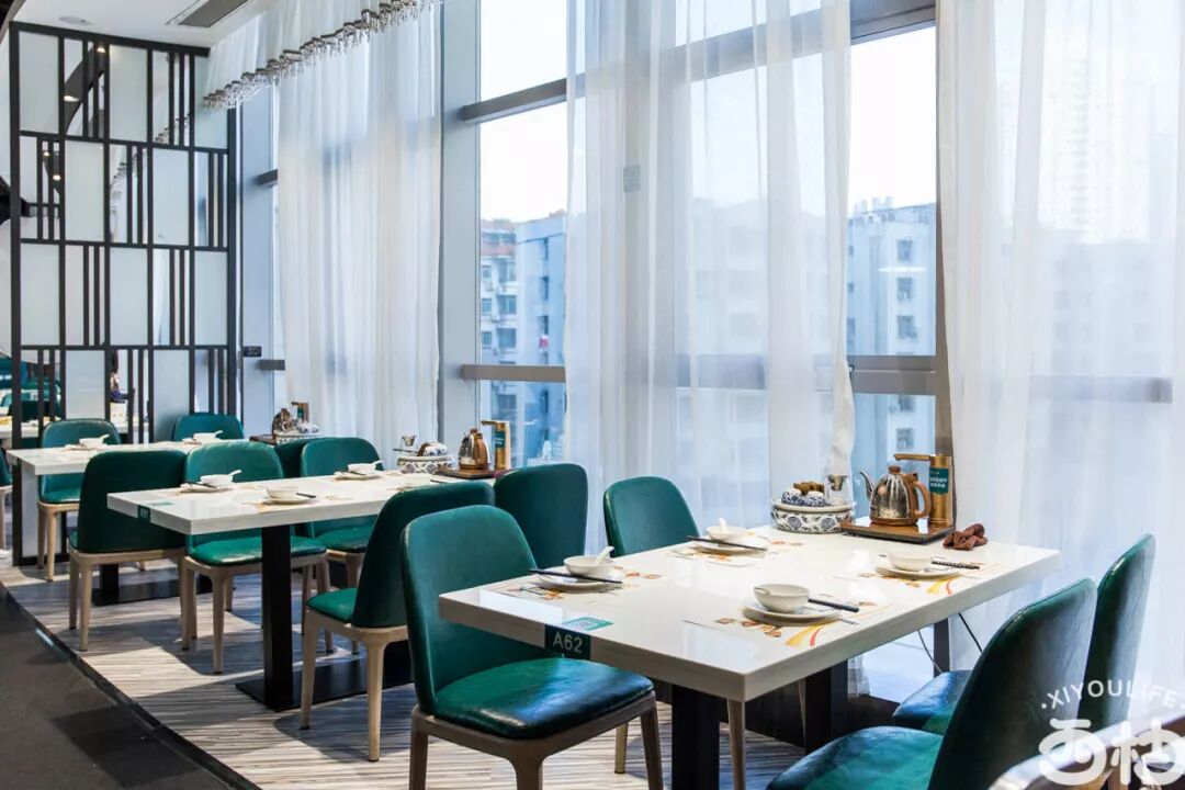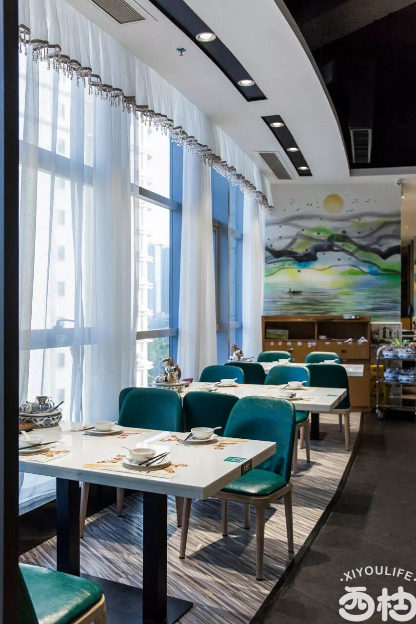 有心德整个用餐占地面积宽大,由A区到B区,可以看到超长明档,手绘的壁画,中西风格交融的用餐区域——落地窗前,4楼景观尽收眼底。