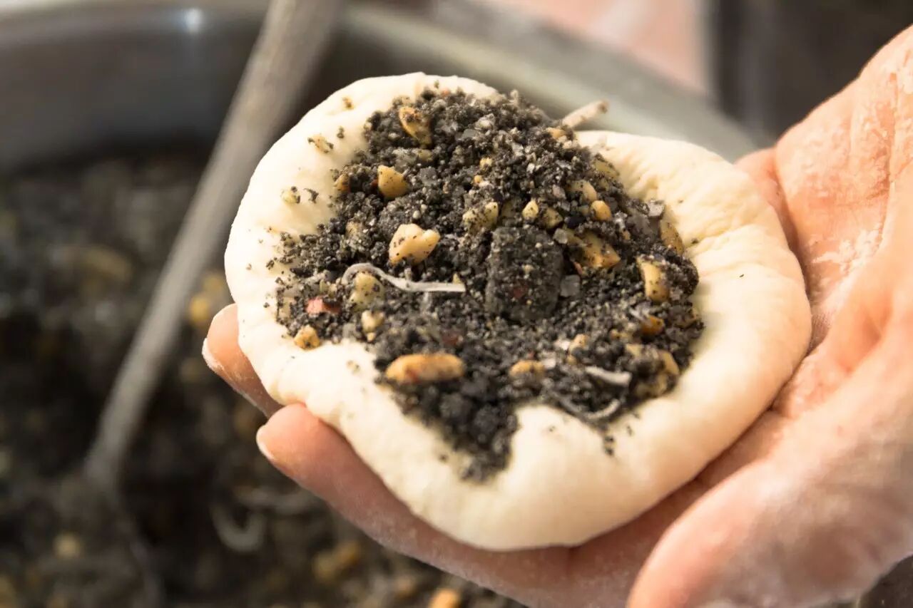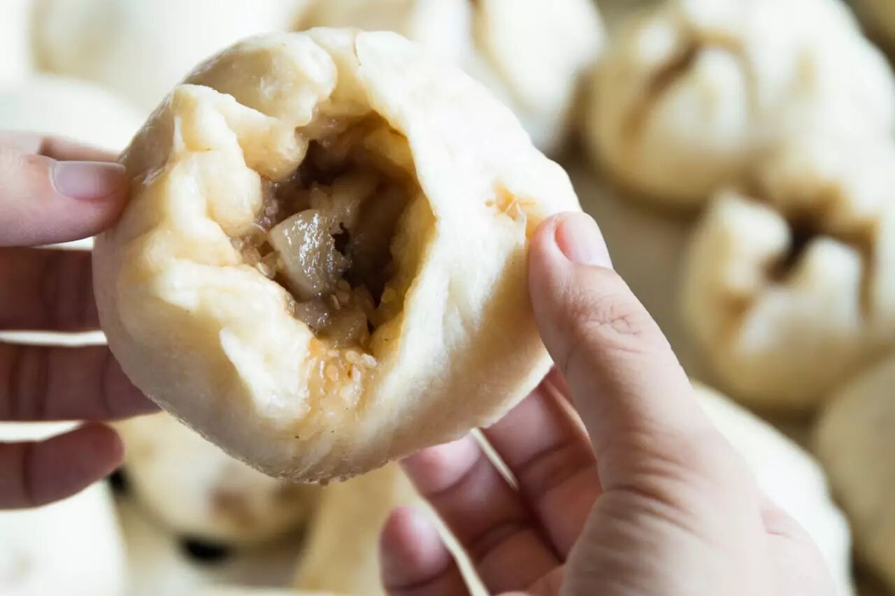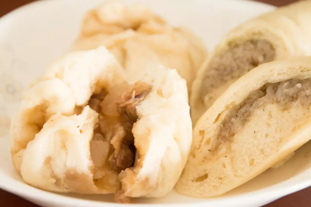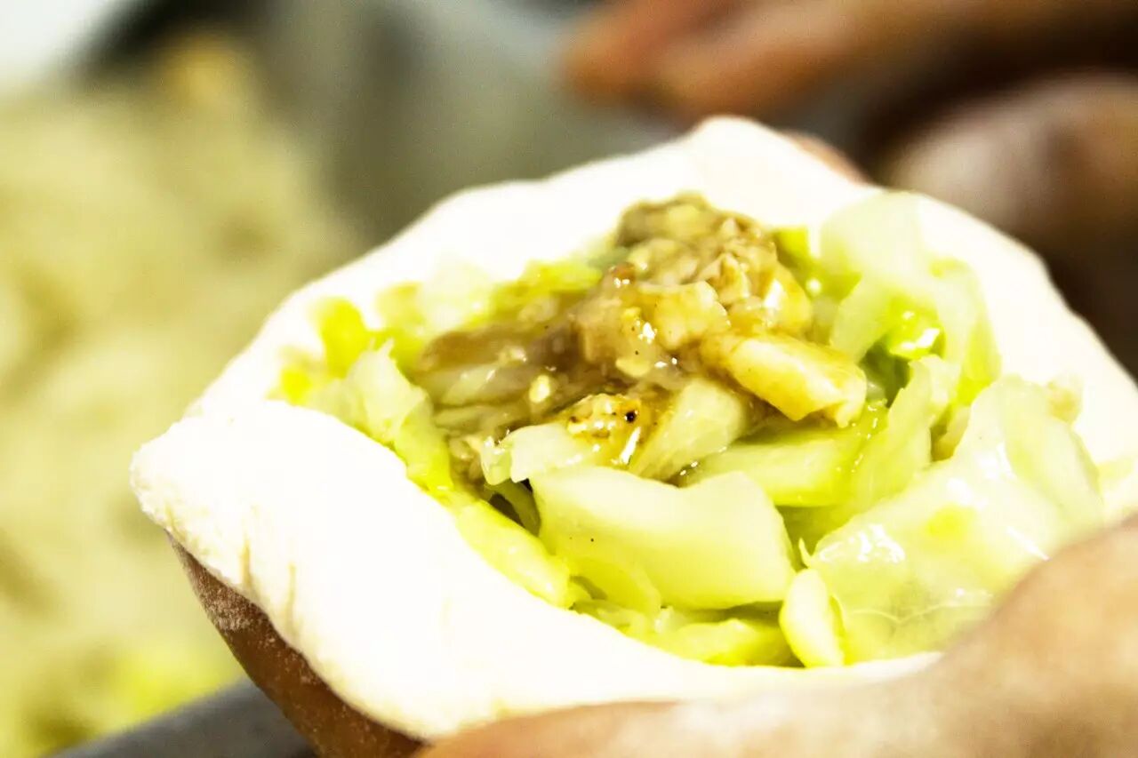 菜包是用新鲜的京包菜加大蒜做的,酱汁鲜甜,舀入事先准备好的菜后,加点大蒜酱汁来维持包子的味道。